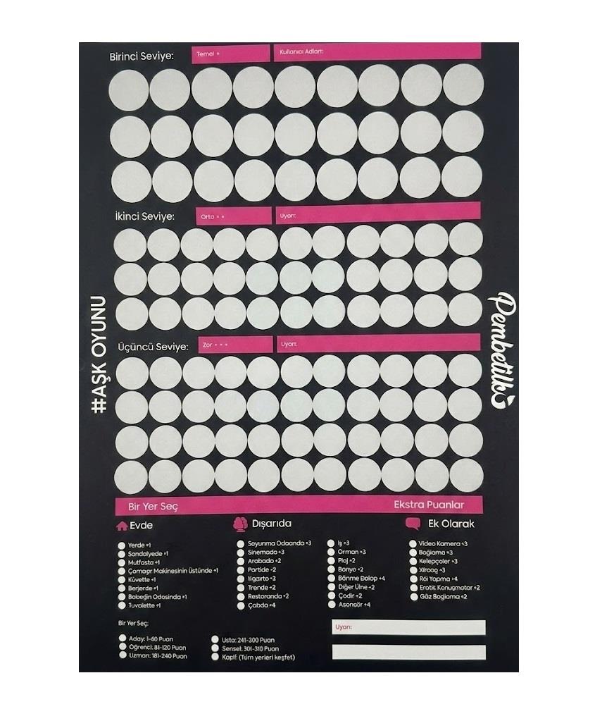İlişkinize heyecan, oyun ve biraz da meydan okuma katmak istiyorsanız bu poster tam size göre! “Aşk Seviyesi 100” üç kademeli (Basic / Medium / Difficult) yapısıyla çiftlere adım adım ilerleyen, her kazıdığınızda yeni bir sürpriz veren eğlenceli bir çift oyunu sunar. Duvara asın, başucunuza koyun ya da özel akşamlarda masaya serin; her bölümde farklı yakınlık görevleri, sohbet başlatıcıları, romantik anlar ve daha cesur deneyimler sizi bekliyor.